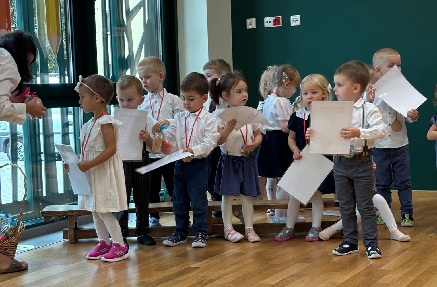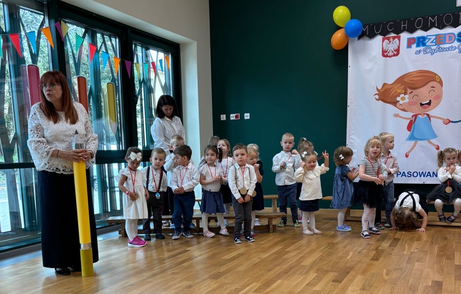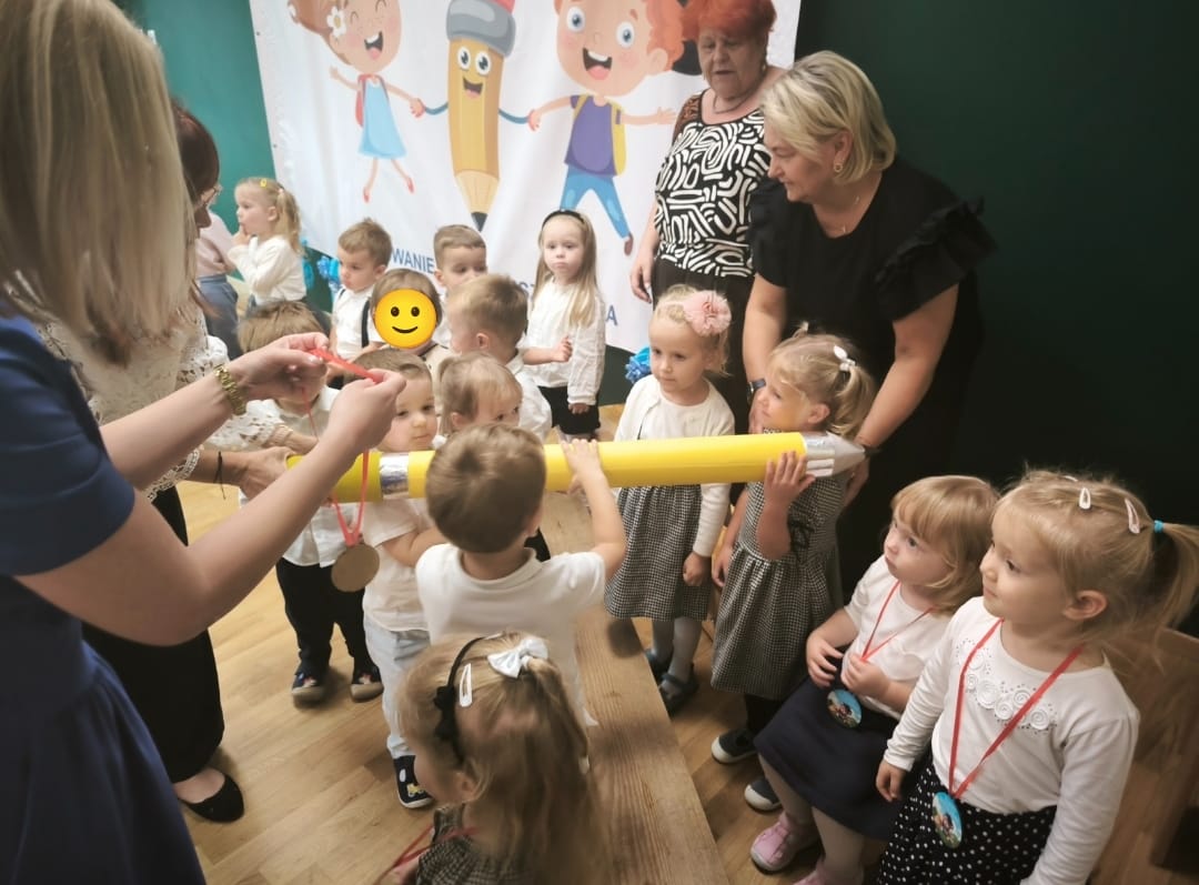 Dnia 25.09.2025r. odbyła się w naszym przedszkolu uroczystość Pasowania na Przedszkolaka. Uroczystość rozpoczęła się od występu artystycznego kolegów oraz koleżanek ze starszej grupy „Chmurki”. Dzieci przywitały nasze maluszki pięknie recytując wiersze oraz tańcząc do utworu „Witajcie w naszej bajce”. Następnie najmłodsi artyści z grupy „Muchomorki” i „Duszki” zaprezentowali przygotowane wiersze, piosenki i tańce. Po części artystycznej dzieci a także ich rodzice złożyli uroczyste przyrzeczenie. Po nim nastąpiła wyczekiwana przez wszystkich chwila Pasowania na przedszkolaka przez Panią Dyrektor, która kładąc ogromny ołówek na ramieniu każdego dziecka, przywitała dzieci w gronie przedszkolaków. Wszystkie dzieci otrzymały pamiątkowe medale oraz dyplomy. To był dzień pełen emocji, miłych wrażeń, który na długo pozostanie w pamięci dzieci i nauczycieli. Gratulujemy naszym maluchom z grup „Muchomorki” i „Duszki” i życzymy, by każdy dzień pobudzał ich wyobraźnię do kreatywnego i twórczego działania, a także aby nowy rozdział w ich życiu, w roli przedszkolaka przyniósł im wiele radości, samych pogodnych i przyjemnych chwil w gronie kolegów i koleżanek.